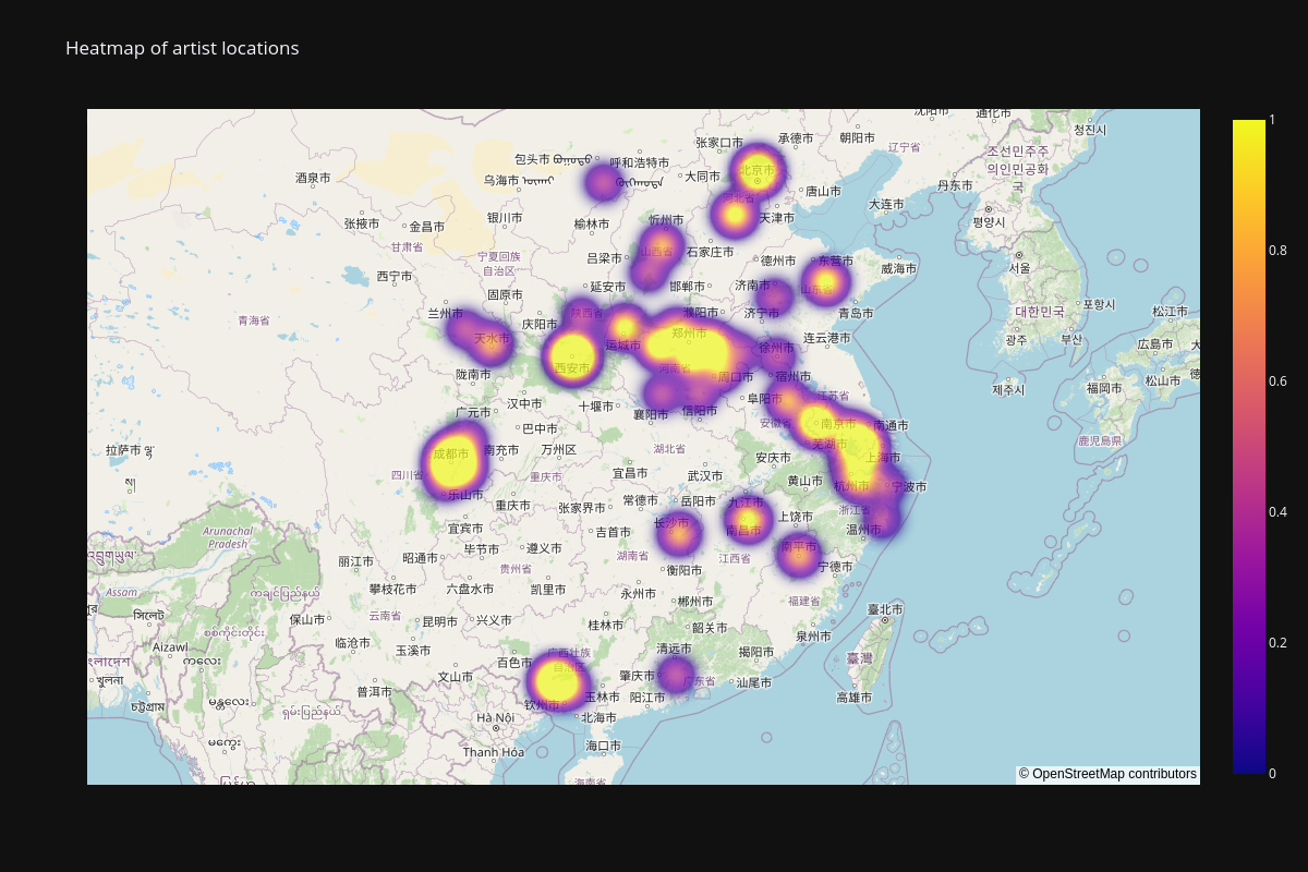 This is the heatmap of artist locations I was able to produce: