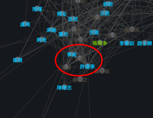 To interpret this visually, we should expect to see artists which painted similar subjects to be in close proximity to each other, and in the same community. For example, Xu Daoning's Chinese Wikipedia page mentions relations to Li Cheng's style and subject matter, and indeed they appear in the same community, and close to each other.